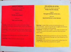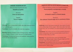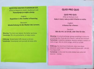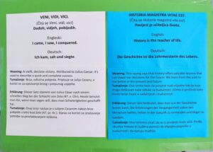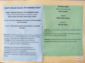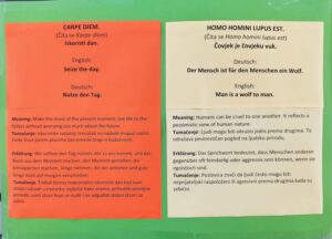 Učenici 7. i 8. razreda s učiteljicama Melitom (8. a i c), Helenom (8. a, b i c) i Klarom (7. a i c), u suradnji sa školskom knjižničarkom, prevodili su latinske poslovice na njemački i engleski jezik. Svaka poslovica zajedno s tumačenjem i prijevodom, isprintana je u drukčijoj boji. Poslovice su u prijevodima većinom podudarne, ali neki učenici pronašli su i nešto drukčija tumačenja (7. a i c) pa su zato stavljene posebno. Prevođenjem poslovica obilježili smo Europski dan jezika a kao motto izabrali smo poslovicu Quod linguas calles, tot homines vales (Koliko jezika poznaješ, toliko ljudi vrijediš). Obilježavanjem Europskog dana jezika započeli smo projekt CARPE DIEM (Iskoristi dan). Cilj projekta je naučiti latinske poslovice, njihova značenja, praktičnu primjenu, i koristiti ih kao motivaciju za kvalitetno korištenje slobodnog vremena. Projekt će se provoditi u ovoj školskoj godini i očekuje nas još puno zanimljivih zadataka!